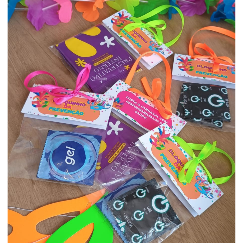 Materiais simples e simbólicos para entrega ao público, combinando mensagem de prevenção, cuidado e responsabilidade de forma acolhedora.